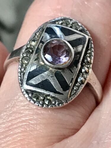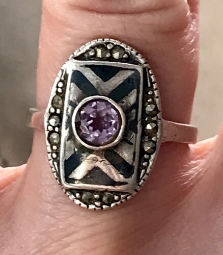 Antik Art Déco Nielo Amethyst Markasite DAMEN RING Silber 925 Gr.54 Schiffchen