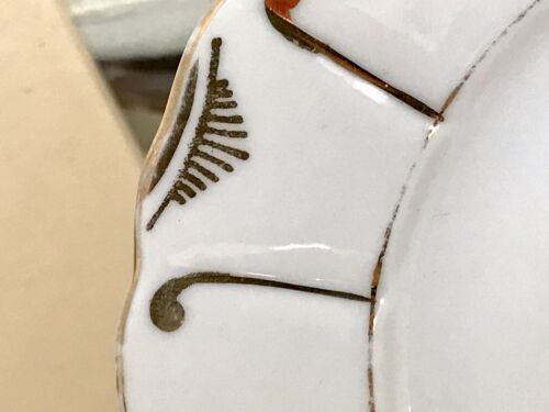 Antik Art Déco Porzellan 2 Untersetzer Untertasse kantig weiß gold