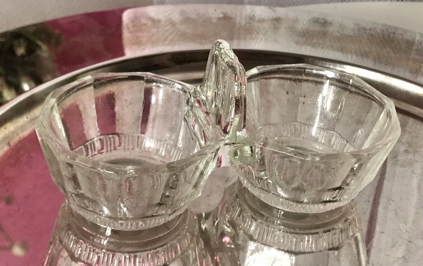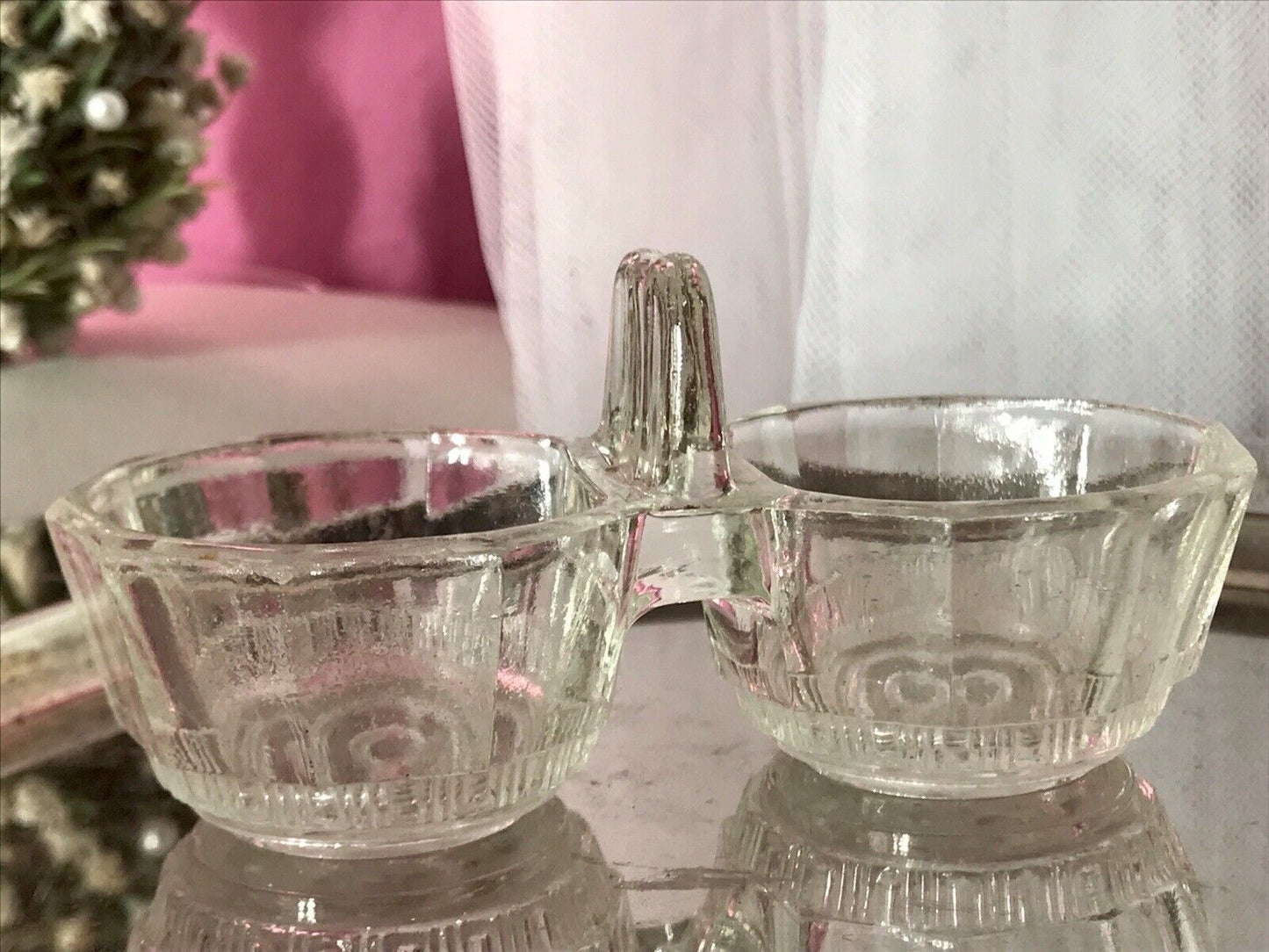 Kommodengriff präsentiert eine wunderschöne antike zauberhafte zweigeteilte Salz&Pfeffer-Menage Saliere aus farblosem Pressglas