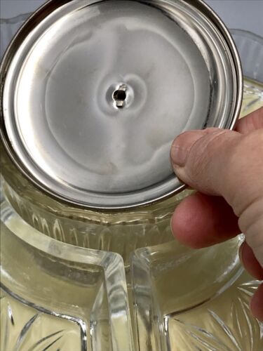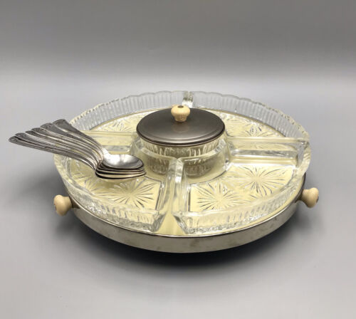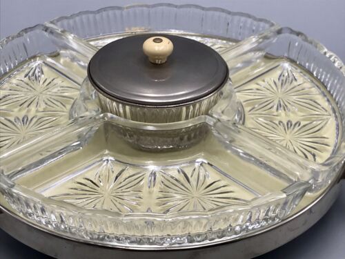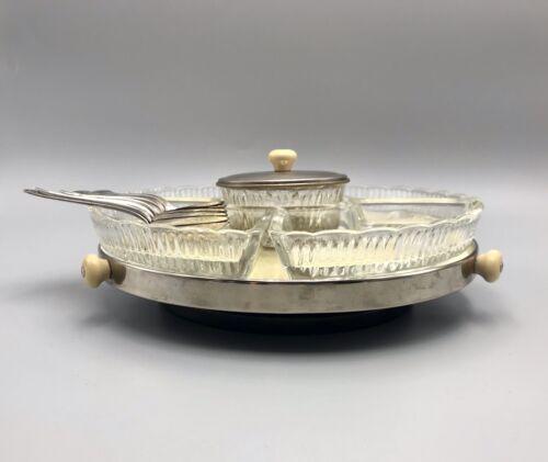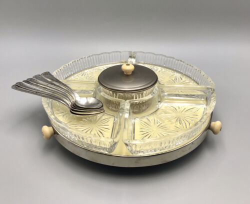 Kommodengriff präsentiert eine zauberhafte dekorative drehbare Kabarett-Schale Tafelaufsatz mit Metallmontur (ver- silbert oder doch verchromt?) und mit Pressglas-Einsätzen