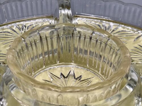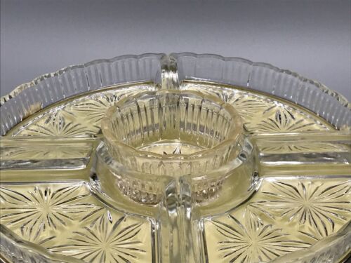 Die Glas-Stellfläche ist unterseitig cremefarben beschichtet und darauf werden die wunderschönen reliefierten Pressglas-Einsätze mit schönem Muster drauf gelegt: 4 halbrunden 1/4 Kreis und mittig eine runde Schale mit Metalldeckel und aus hellem wohl Bakelit?-Knauf.