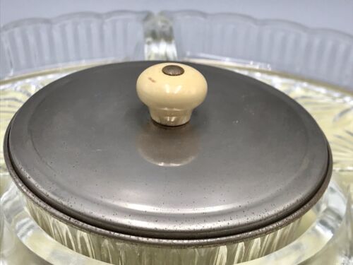 Das mittige Schälchen ist höher als die um sie gelegte Einsätze, darauf wird der Metalldeckel drauf gelegt, dieser hat ebenfalls aus hellem Bakelit gearbeitetes schönes Griffchen.