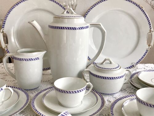 Antik Art Déco Tirschenreuth Porzellan Kaffeeservice 9 Pers. weiß lila Goldrand
