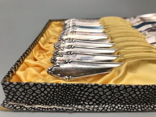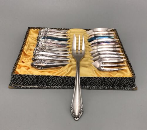 Kommodengriff präsentiert versilbertes antikes Art Déco Kuchen-Besteck 12 Kuchengabeln von Julius Kratz Solingen im Original?-Kasten