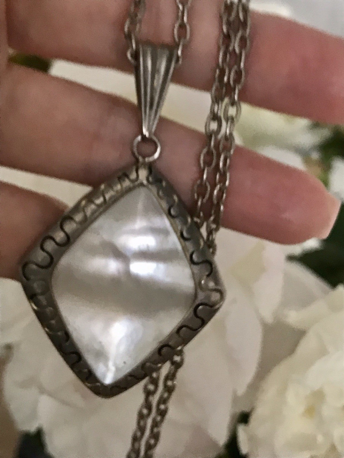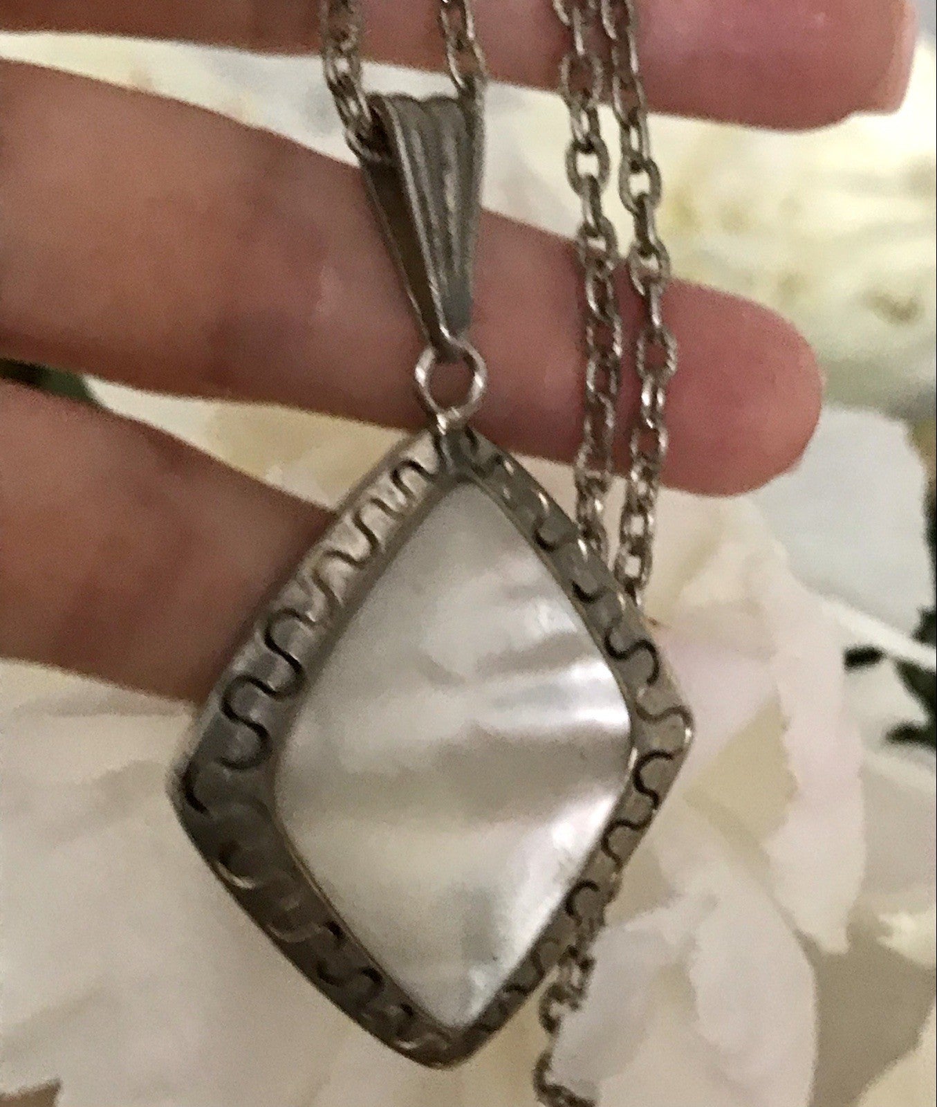 Antik Art Déco versilbert Halskette Perlmutt?Stein Anhänger AH