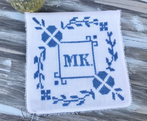 Antik Aufbewahrung Täschchen Beutel bestickt Monogramm MK weiß blau