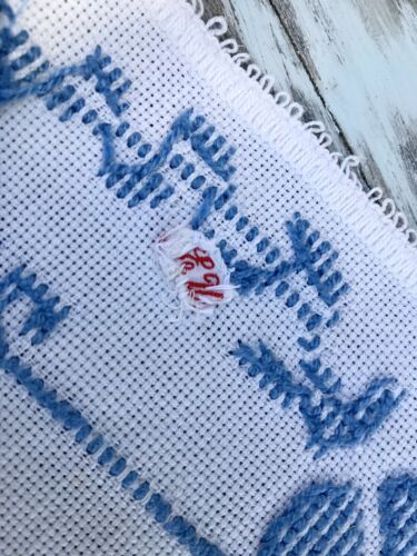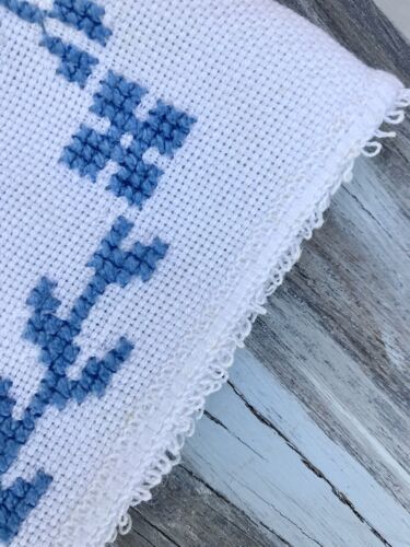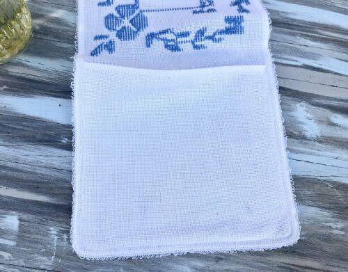 Kommodengriff präsentiert eine wunderschöne antike weiße quadratische handbestickte Aufbewahrung Täschen wohl im Bad zum Aufhängen? oder zum Tascgentücher oder anderes aufzubewahren ? in weiß blau