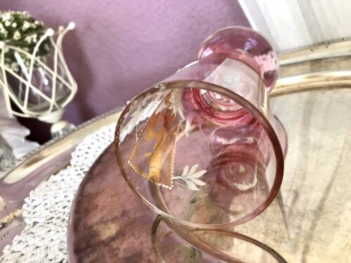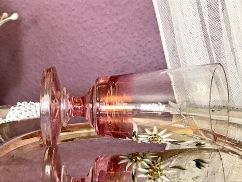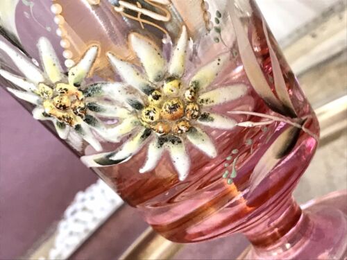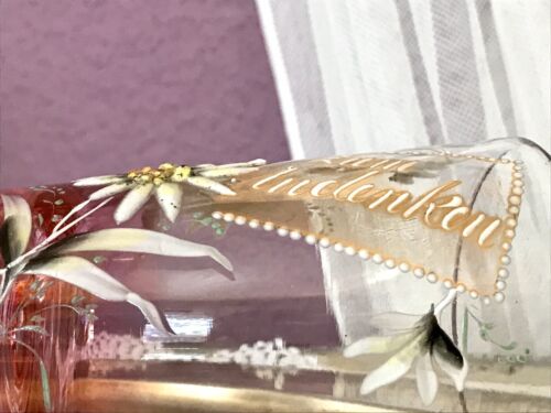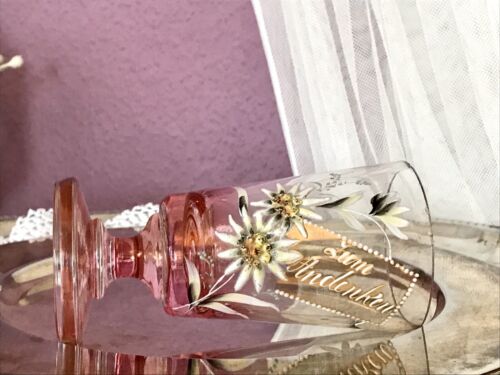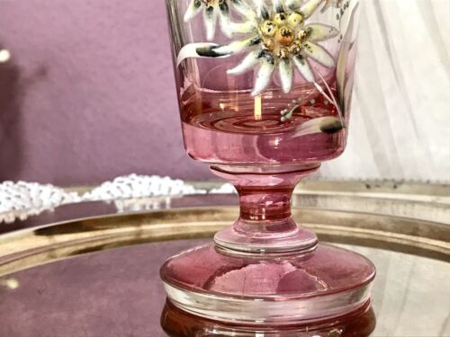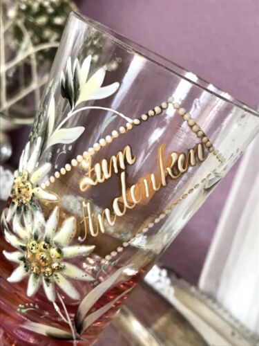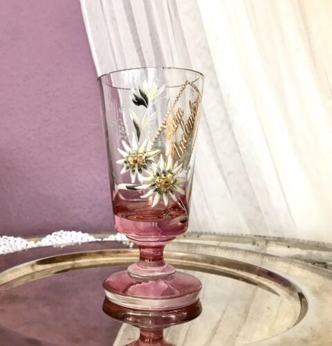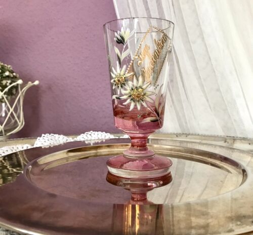 Kommodengriff präsentiert ein wunderschönes altes antikes großes Andenken-Glas Glas Fußbecher Pokal Bierglas? in pinkfarbenem Verlauf und aus dickem schweren Glas mit massivem runden Standfuß und sowie wunderschön mit fantastischer opaken aufwendigen Edelweiß-Hochemail Email-Malerei mit transluzidem feinem Golddekor als Hintergrund der Schrift: Zum Andenken ausstaffiert.