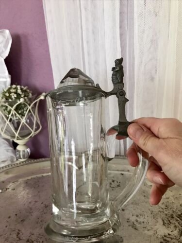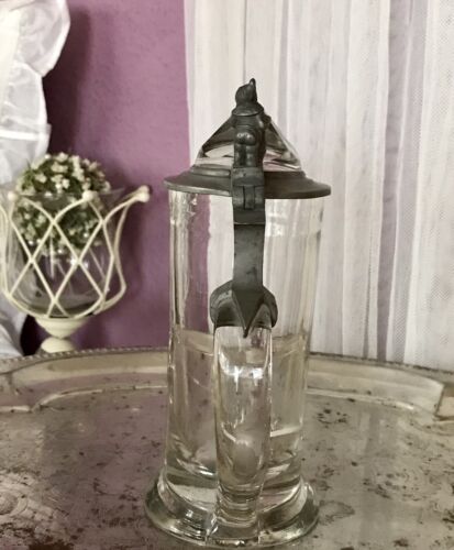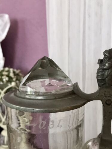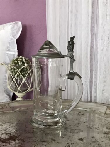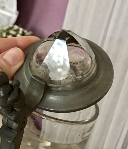 Antik Bierkrug Glas Krug Seidel Humpen Zinndeckel Bergkristall ? kurioser Zwerg