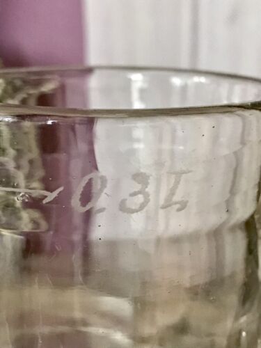 Mit breiterem Fußring, zylindrischer Wandung und Eichstrich mit 0,3 L Angabe eingraviert oder geätzt.