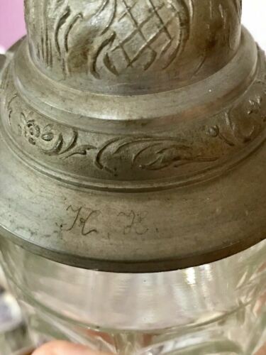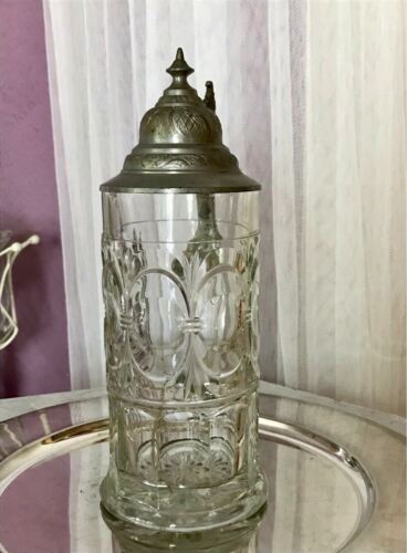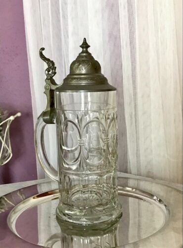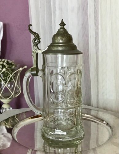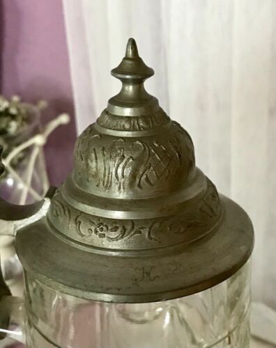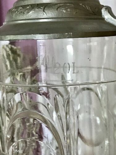 Antik Bierkrug Glas Krug Seidel Humpen Zinndeckel Pressglas 10/20 L Monogramm