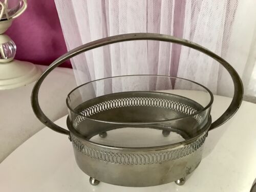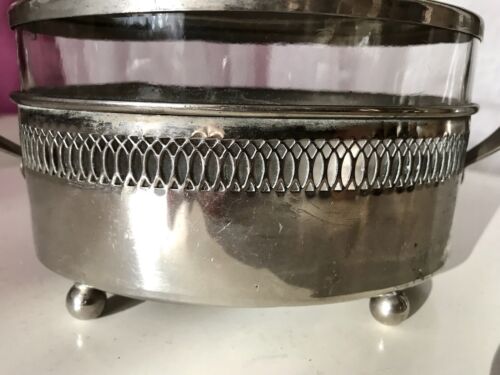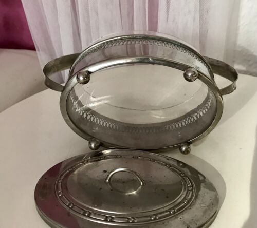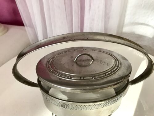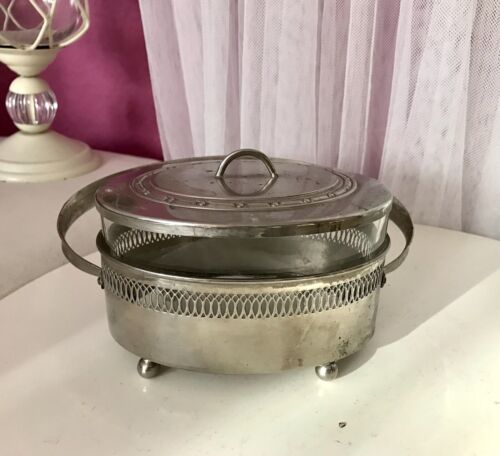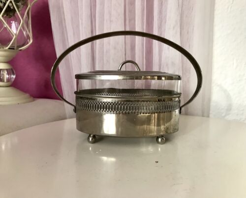 Kommodengriff präsentiert eine 3teilige wundervolle antike dekorative ovale Jugendstil-Art Déco Keksdose Bonboniere Glasdose Konfektdose mit Glaseinsatz und versilbertenr oder verchromter Metallmontur mit Deckel