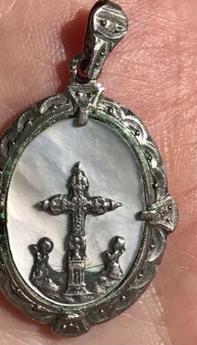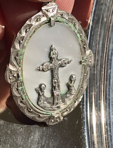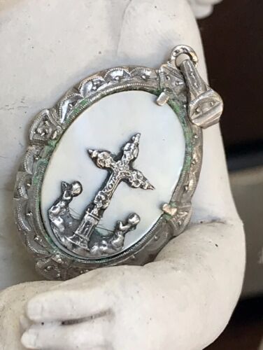 Antik Edel Anhänger Kettenanhänger Silber Perlmutt unter Kreuz bettende Puttis