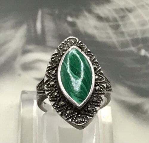 Antik Edel Art Déco Malachit Markasite DAMEN RING Silber SUPER Gr.51 16,3
