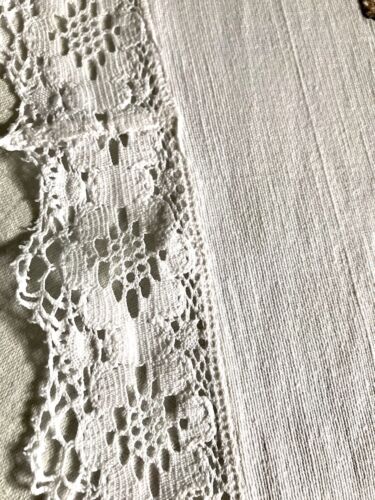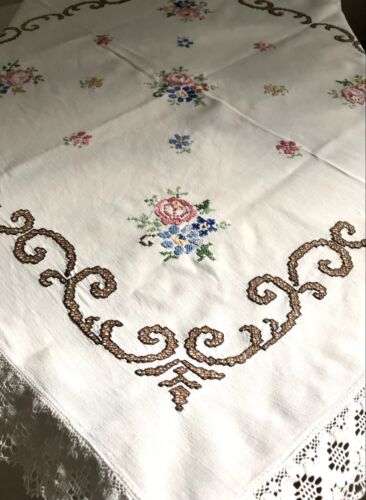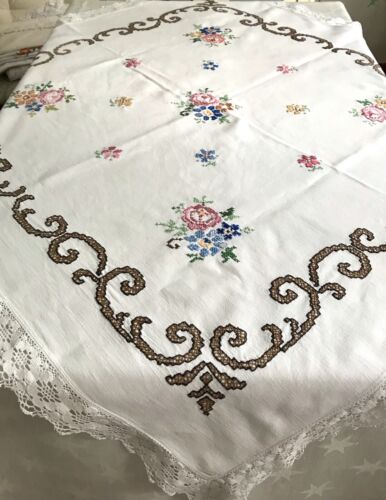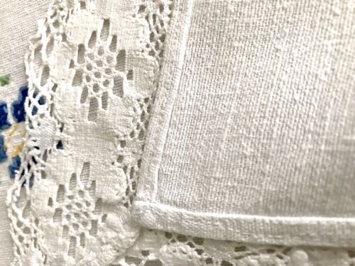 Kommodengriff präsentiert eine wunderschöne antike naturweiße bunt bestickte rechteckige schöne Leinen-Tischdecke Tafeltuch aus Leinen