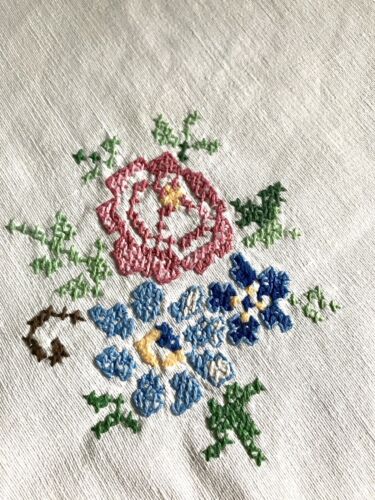 Mit schöner buntem floralen Rosen- Stickerei in Kreuzstickerei- Technik gearbeitet.