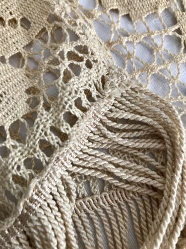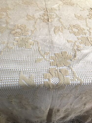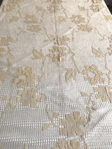 Kommodengriff präsentiert eine einmalig schöne wundervolle beigefarbene(Milchkaffe bzw. Cappuccinobeige) rechteckige antike große Tischdecke bzw. Bettüberwurf aus Filetspitze