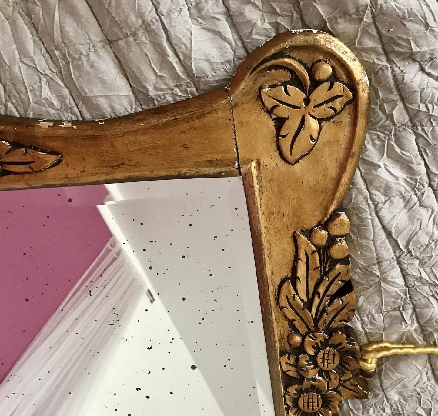 altersbedingter Zustand mit altersbedingten aber charmanten Gebrauchspuren insbesondere der Spiegeloberfläche (schwarze Flecken unterschiedlicher Größe) und am Rahmenrand, siehe Bilder!