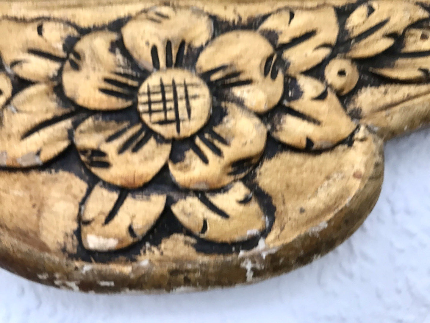 Aus Holz, vermutlich Weichholz und vorderseitig goldfarben lackiert.