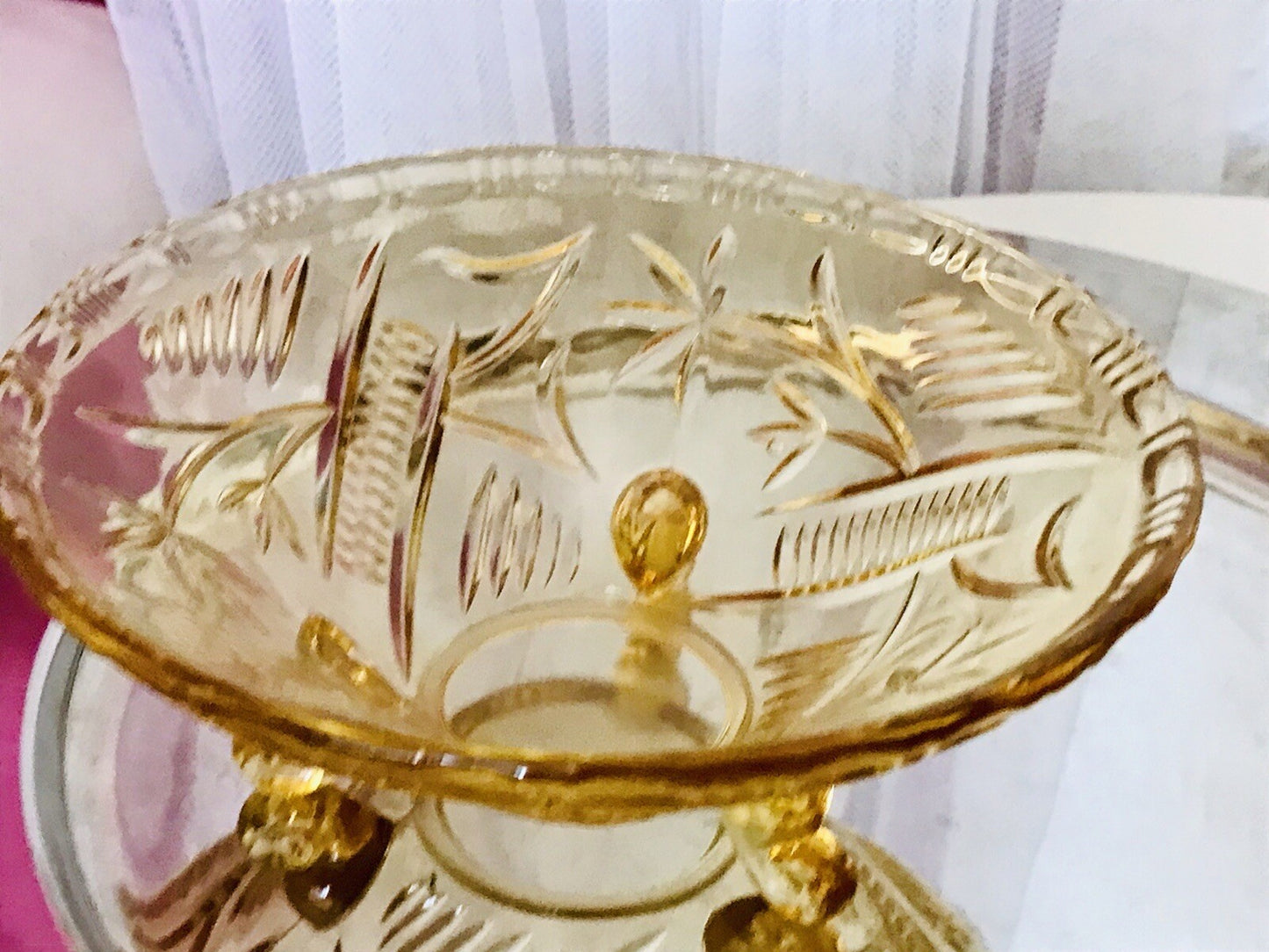 Kommodengriff präsentiert eine wunderschöne antike gelbe Glas-Schale Glasschale Schale Anbietschale Obstschale aus bernsteingelbem Pressglas Glas und wunderschönem passigen floral stilisierten geometrisierten Muster und auf 3 Füsschen stehend