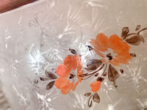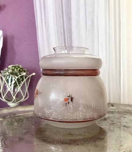 Mit teils klarem Glas, teils satinierten und geätztem Part am bauchigen Teil mit schönem Muster und opaker floralen Malerei.
