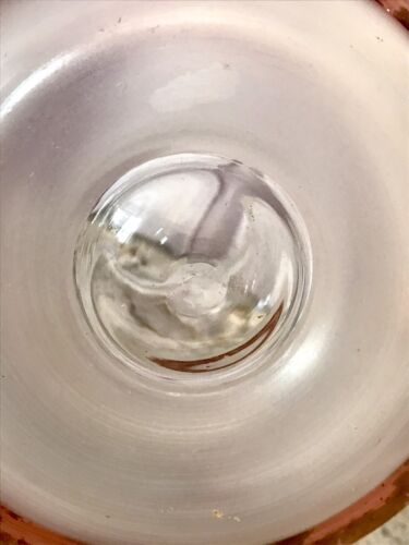 Unten geschlossen mit abgesetztem abgerundeten Teil und farbigem breiten Rand in etwa altrosa/Rosenholz mit schönem Verlauf und ganz leicht irisierend.
