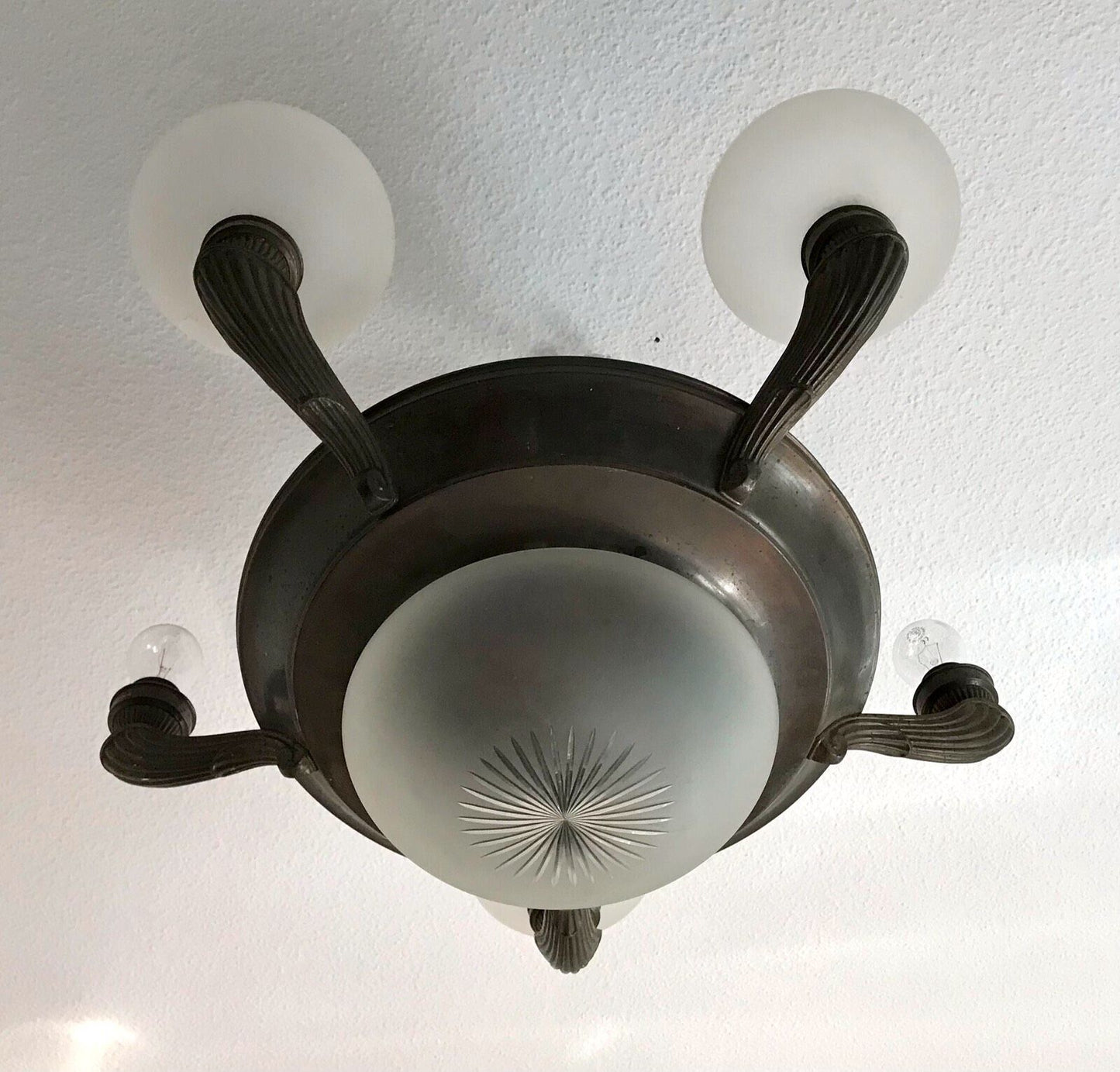 Davon strahlenförmig 5 wundervoll reliefartig gearbeitete Lampenarme, auf die halbrunde satinierte Glasschirme platziert werden.