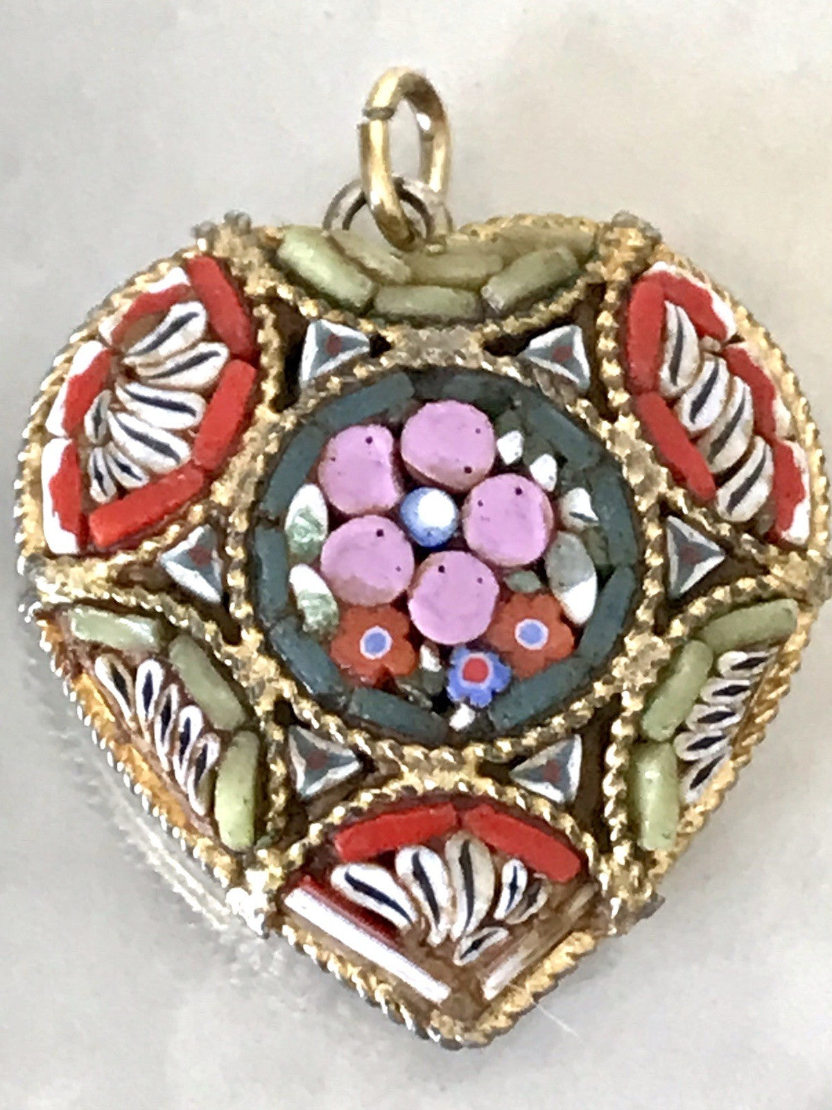 Kommodengriff präsentiert einen wundervollen zauberhaften alten antiken Italienischen herzförmigen Micromosaik-Kettenanhänger Anhänger