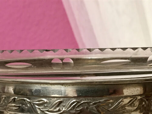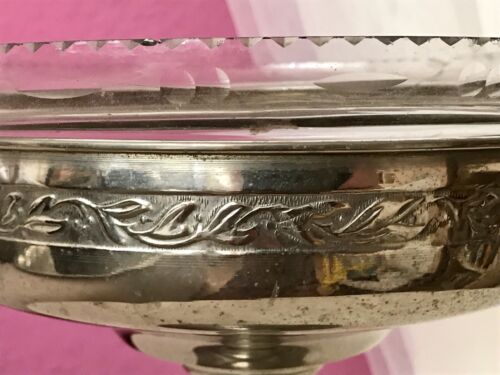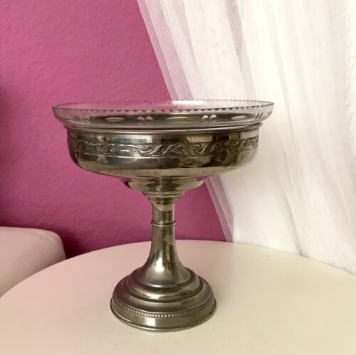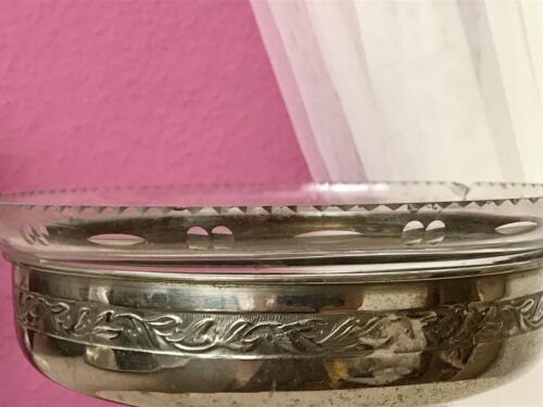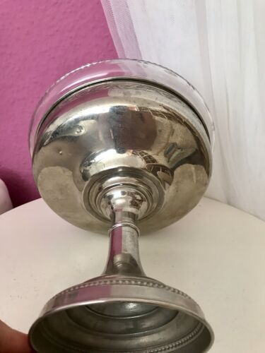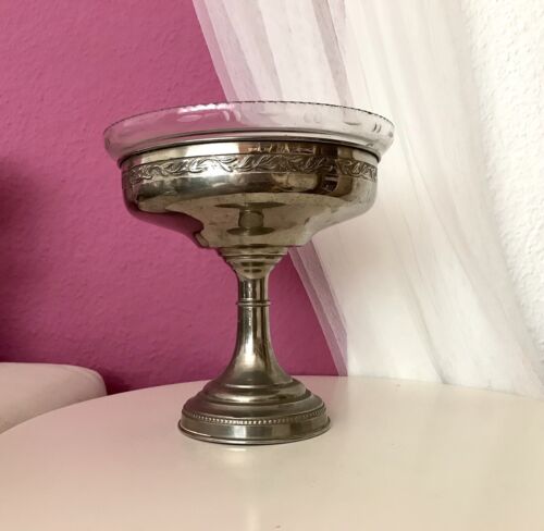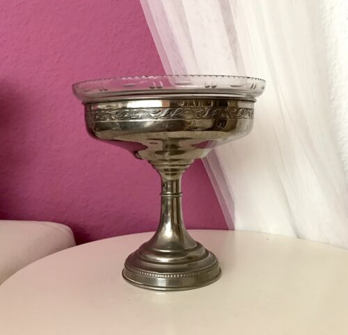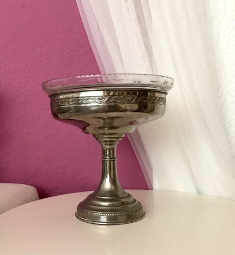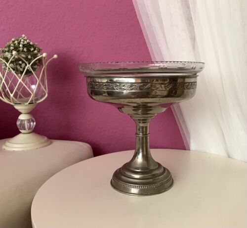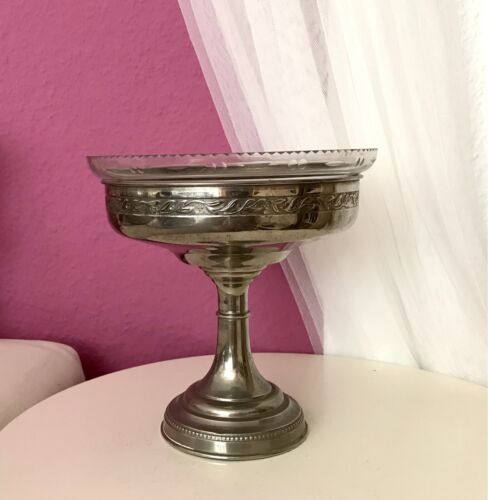 Kommodengriff präsentiert einen wunderschönen seltenen recht großen wohl versilberten oder doch verchromten (vernickelten? Näheres unbekannt) Tafelaufsatz Aufwarteschale Anbietschale Schale auf Fuß mit fest fixiertem Glaseinsatz/Schale aus mundgeblasen geschliffenen Glas
