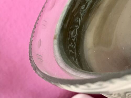Metallmontur altersbedingt mit etwas Patina/ insbesondere innen unter dem Glaseinsatz angelaufen, am oberen Rand bestoßen(Stück fehlt und von hier aus abwärts mit 1 Sprung/Riss, nebenan noch 1 kleine Bestoßung des oberen Randes und desweiteren noch eine etwas weiter.
