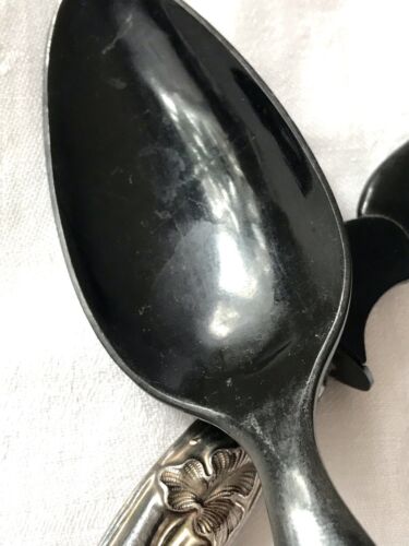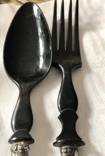 Kommodengriff präsentiert ein wundervolles sehr dekoratives antikes 2 teiliges Salatbesteck mit dem Silbergriff und wohl Bakelit