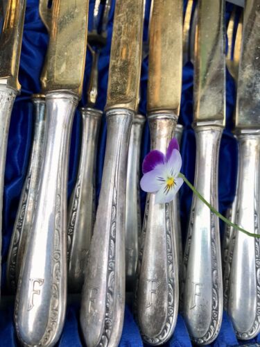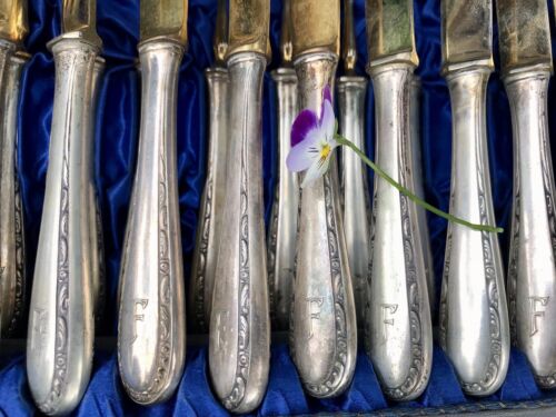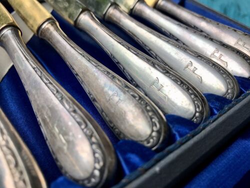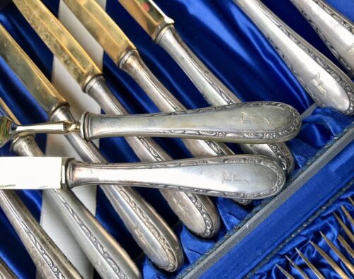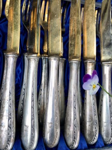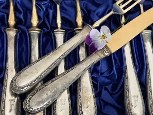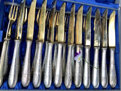 Antik Jugendstil 800 Silber Obst-Besteck vergoldet 12 Personen im Besteckkoffer