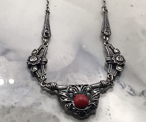 Antik Jugendstil Art Déco 835 Silber Collier Halskette roter Stein & Markasite