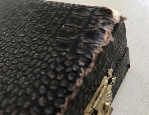 Besteckkasten befindet sich in einem altersbedingten jedoch noch recht passablen Zustand mit Gebrauchspuren: Bestoßungen und Rissen des Obermaterials, Ecken mit Bestoßungen, am Innenstoff mit rostigen Flecken vom Besteck .