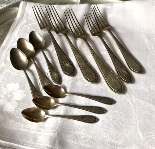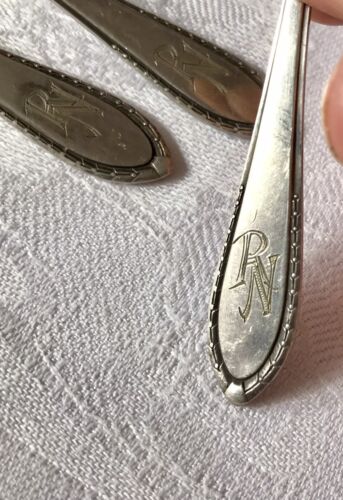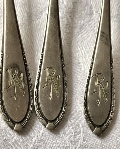 Kommodengriff präsentiert ein Konvolut von antikem versilberten Tafel-Besteck Speisebesteck mit Jugendstil -Muster und Monogramm RN