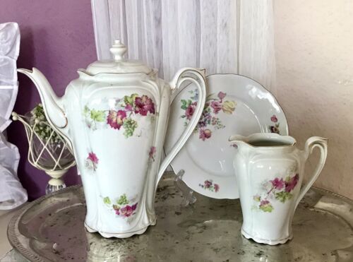 Antik Jugendstil Porzellan Kaffeekern Kanne Sahnegießer & 1 Teller