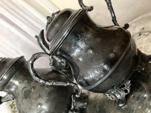 Kommodengriff präsentiert einen wunderschönen antiken in viktorianischem Stil gehaltenen 3 teiligen versilberten silberplattierten Sahne-Satz Kernstück Milch&Zucker Kaffeekanne bzw. Teekanne Zuckerdose& Sahnegießer m