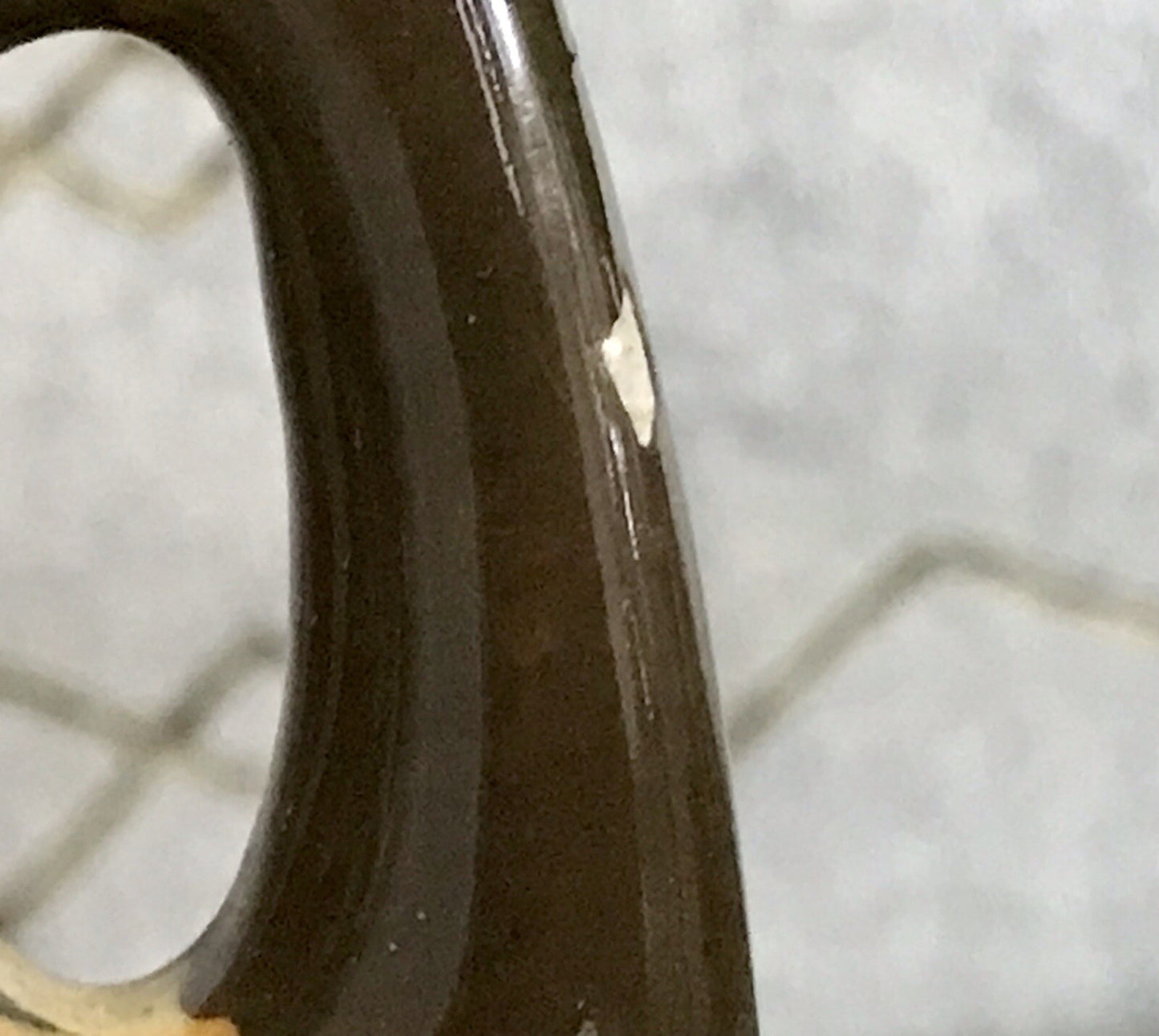 - Altersbedingter eigentlich schöner Erhaltungszustand, lediglich 3 Bestoßungen: 1 über dem Stand und je 1 Abplatzer der Glasur am je 1 Henkel.