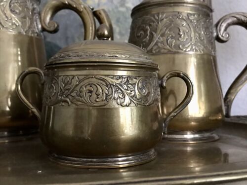 Antik Kernstück Zuckerdose Rahmgießer 2 Kanne Tablett Messing ehemals versilbert