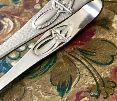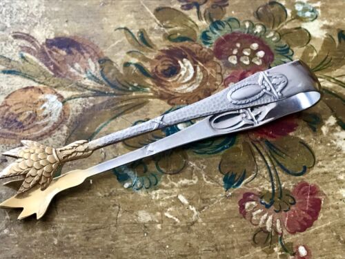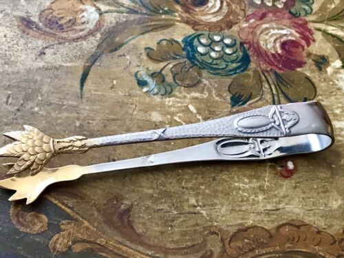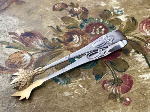 Kommodengriff präsentiert eine antike wunderschöne elegante wohl verchromte Zuckerzange mit goldfarbenem Greifer