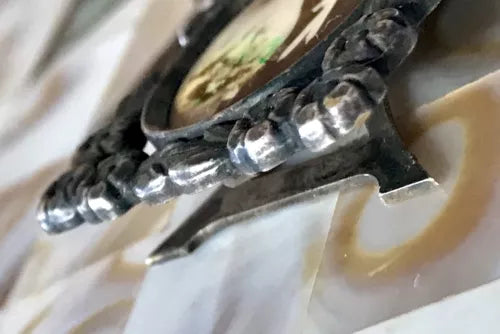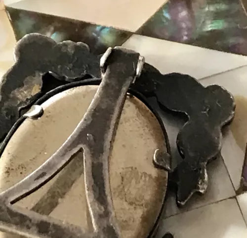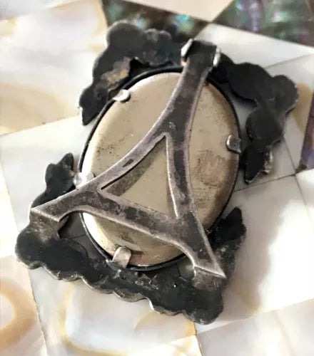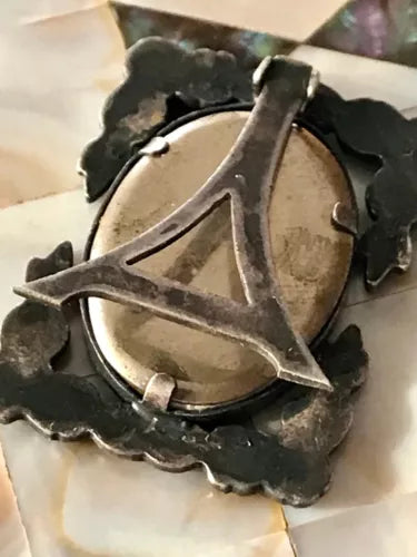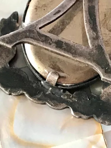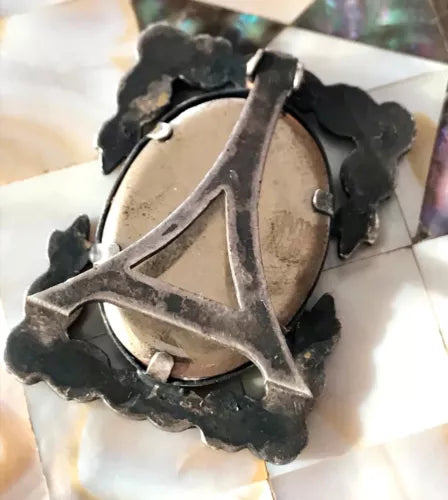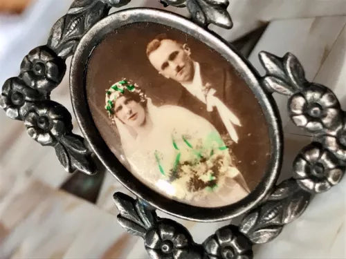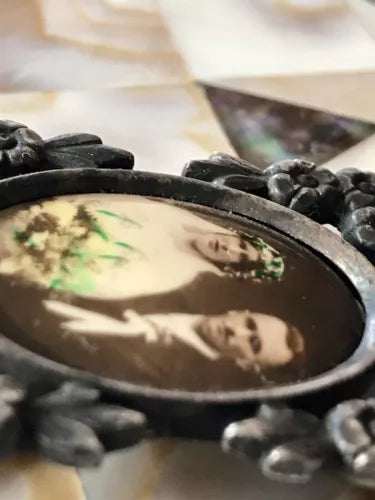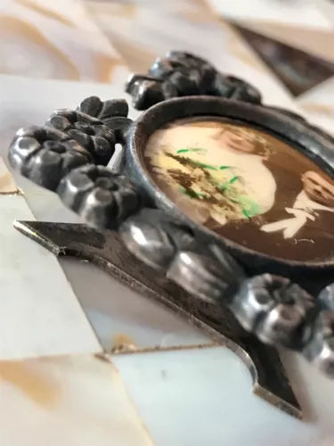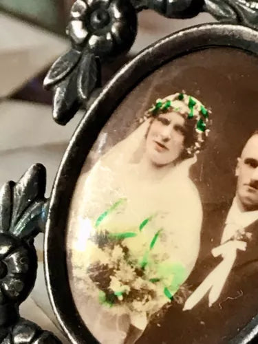 Das mittige Oval/ Medaillon für das Foto weist auf der Rückseite eine Deckplatte aus Metall und 6 Krappen auf.