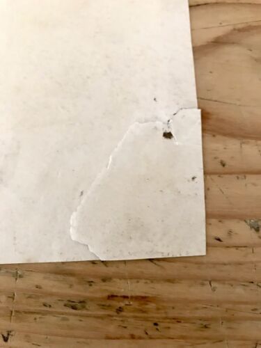 Obere Ecke kleines Stück abgerissen, darunter ausgerissenes Loch
