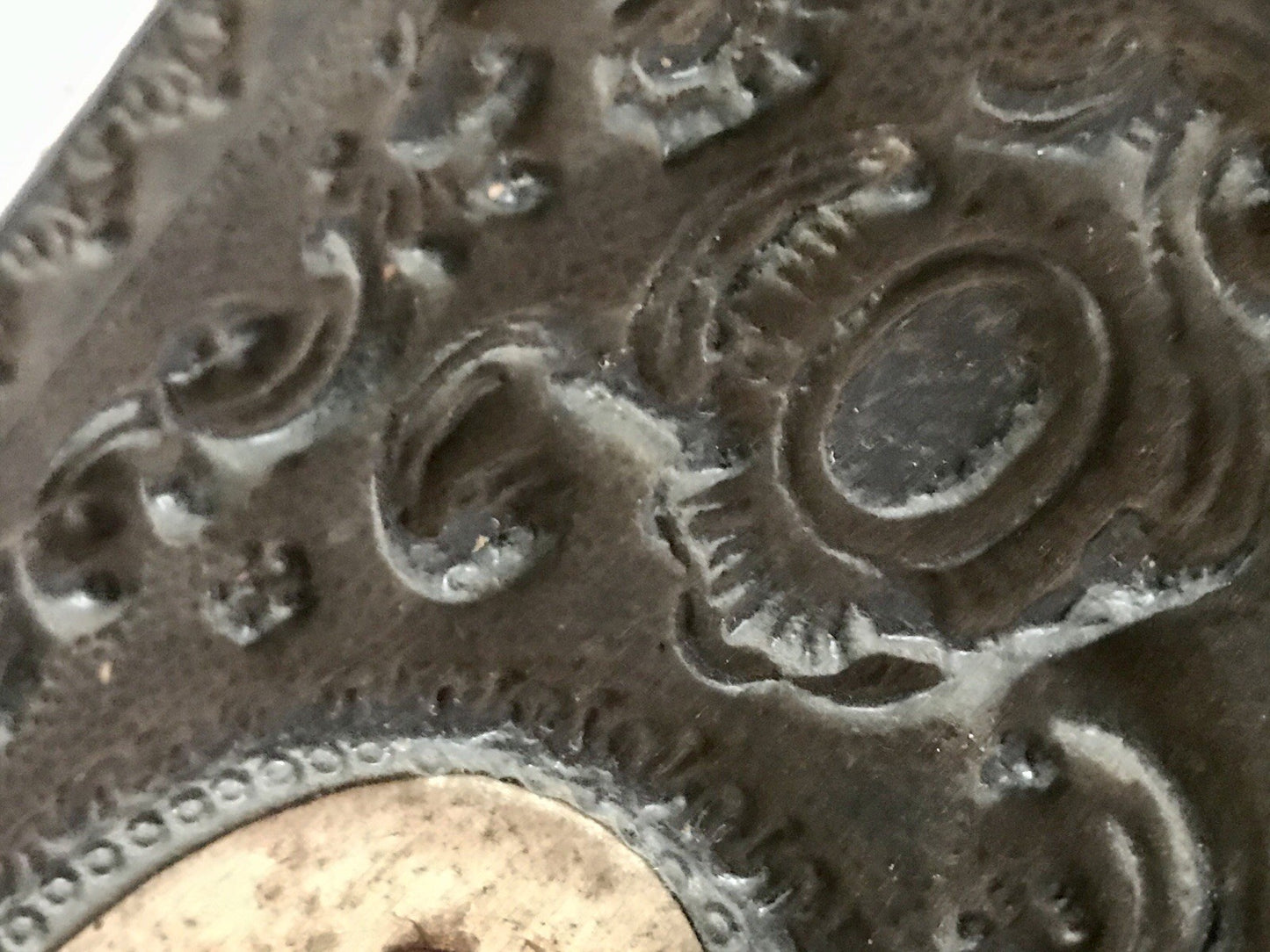 Mit auflegbarem hübschem dicht geprägten Deckel mit Voluten und mittigem ovalem Feld mit geprägtem floral stilisierten bunten Muster in Stickerei-Optik.