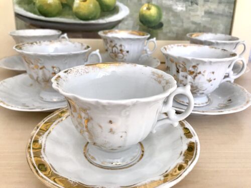 Antik Porzellan 6 Pers. Kaffeeservice Tassen Weiß Golddekor Andenken Schriftzug
