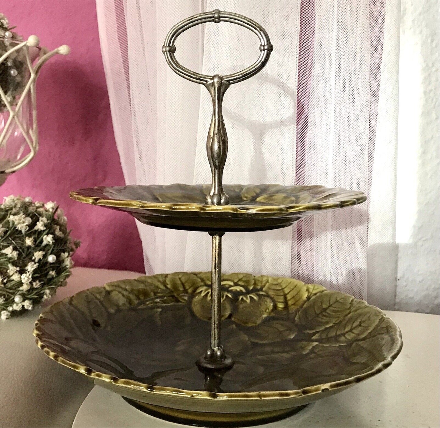 Kommodengriff präsentiert 1 wunderschöne sehr dekorative antike runde zweistöckige Etagere Schale von Sarreguemines