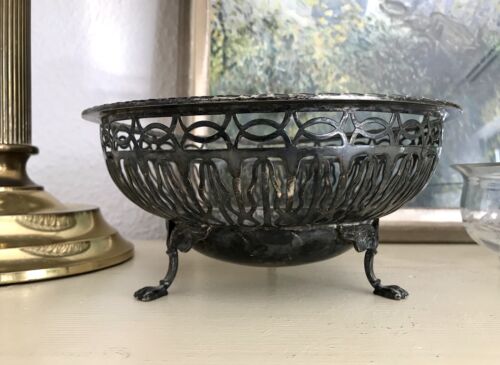 Die wunderschöne runde antike Schale Tafelaufsatz ist größtenteils in wunderschönem Durchbruchmuster gearbeitet und steht auf 3 schön ausgearbeiteten Füßchen.