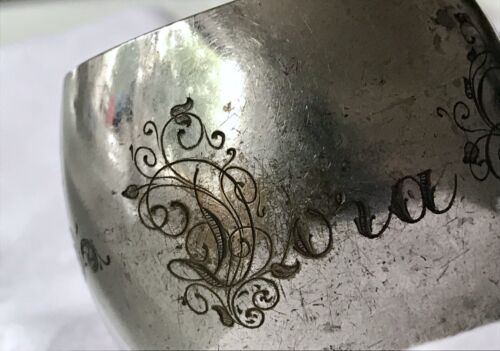 Kommodengriff präsentiert einen wunderschönen antiken versilberten gravierten Servietenring mit dem Namen Dora Parthenay