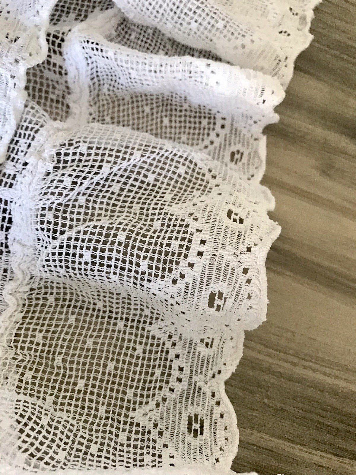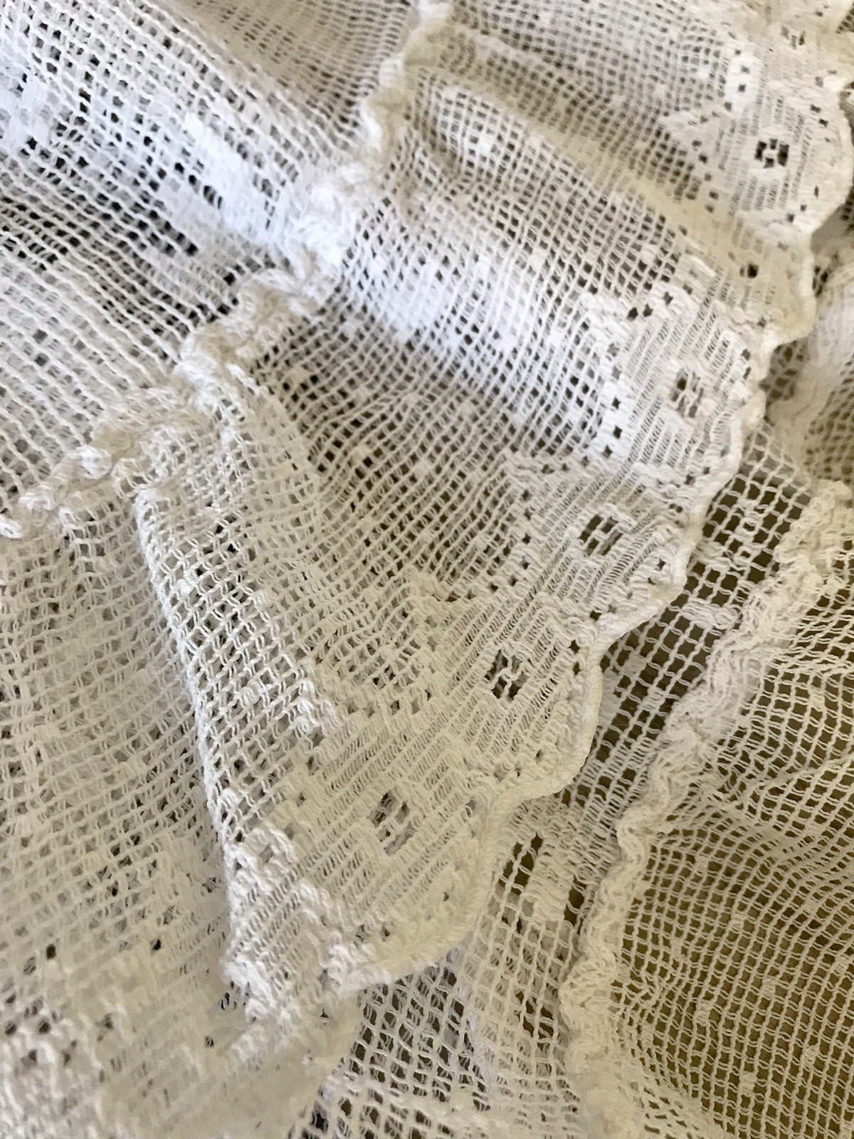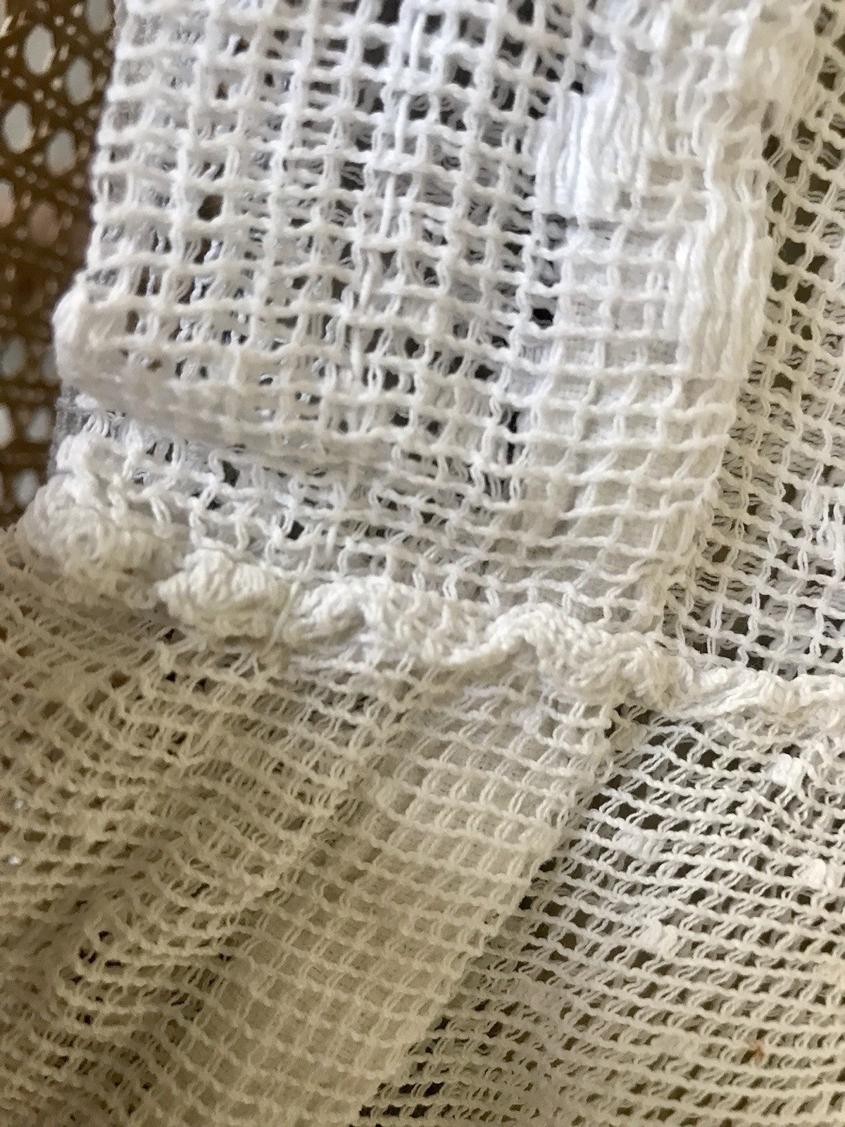 Aus wunderschöner Spitze, vermutlich Musselin? Oder Filetspitze oder geklöppelt vielleicht? Näheres unbekannt.
