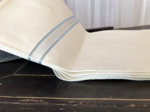 Kommodengriff präsentiert einen Satz von 6 mit blauer Organza gebündelten handbestickten nicht aufgearbeiteten Taschentüchern oder Servietten wohl aus feinerem Leinen