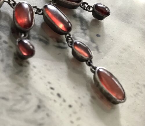Das wundervolle antike Collier ist mit festem aus einzelnen baumelnden in Zargenfassung gefassten in Cabochonschliff geschliffenen ovalen braunroten bzw. rotbraunen Steinen, die ein mittiges kaskadenartiges Arrangement an schöner Kette bilden.